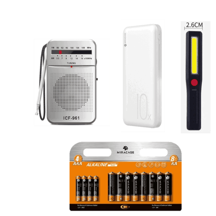 באנדל חירום הכולל סוללת גיבוי רב תכליתית נטענת פנס רדיו FM וערכת סוללות
