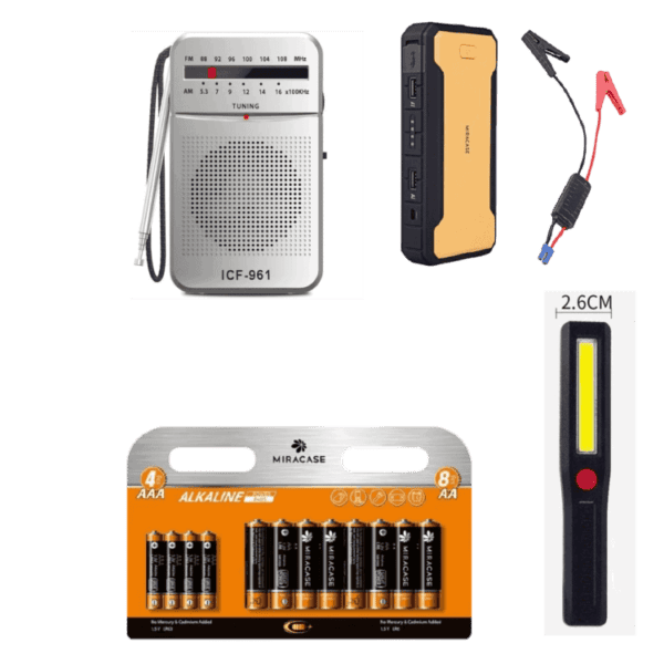 באנדל חירום הכולל סוללת גיבוי רב תכליתית פנס רדיו FM וערכת סוללות