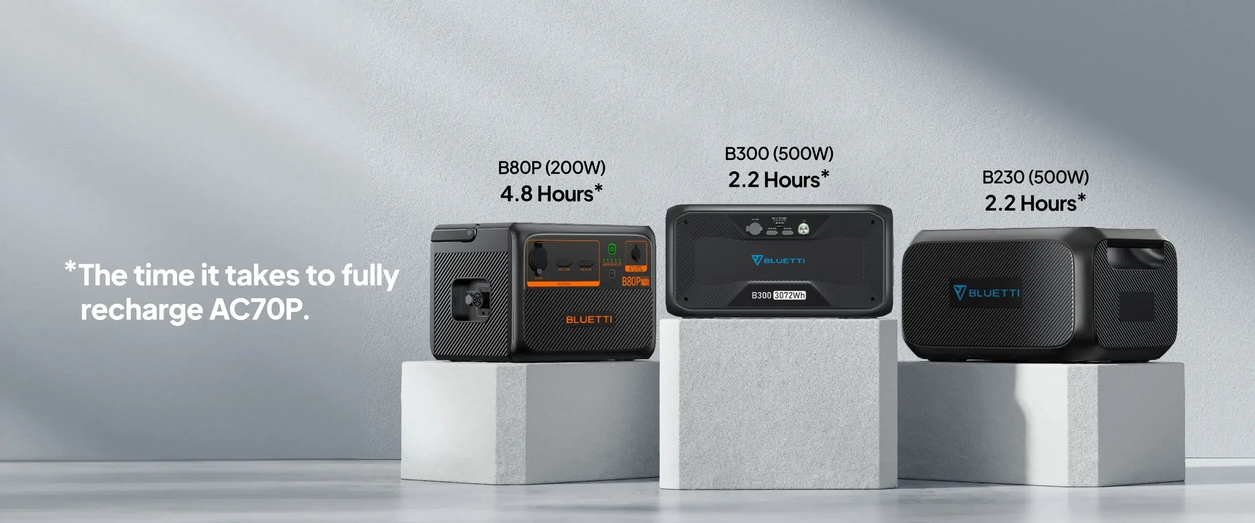 חוששים שיגמר החשמל במהלך המסע? AC70P תואם ל-B80P (806Wh), B230 (2.048Wh) ו-B300 (3.072Wh) לחיי סוללה ממושכים ללא דאגות