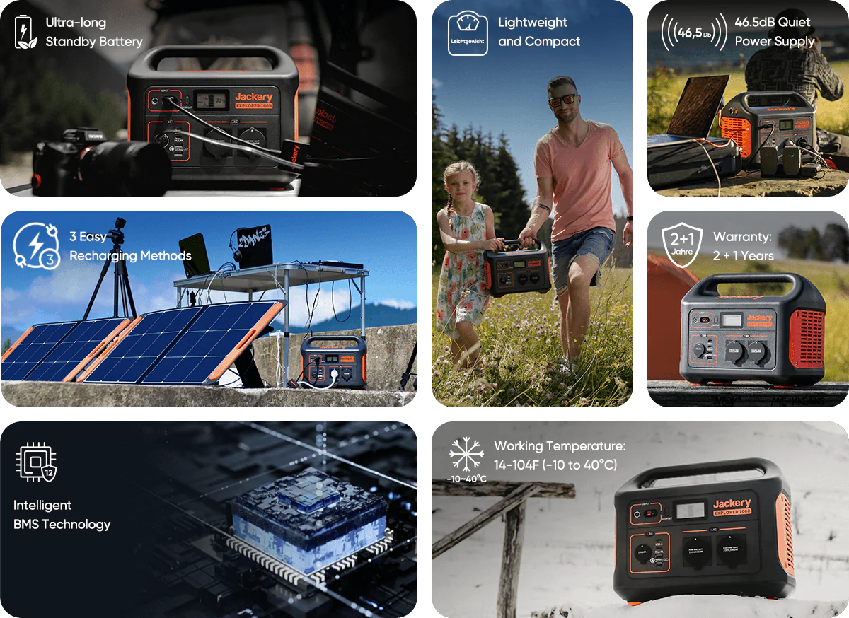 Jackery Explorer 1000 Portable Power Station טוען שמונה מכשירים בו זמנית. עם קיבולת סוללה של 1002Wh, תחנת הכוח הניידת מתאימה לטעינת כל המכשירים במהלך קמפינג והפסקות חשמל. תכונות מצוינות של תחנת הכוח Explorer 1000 כוללות שלושה שקעי AC סטנדרטיים בגל סינוס טהור, עיצוב קומפקטי, בקר טעינה MPPT ותחנת כוח שקטה ברמה תעשייתית.